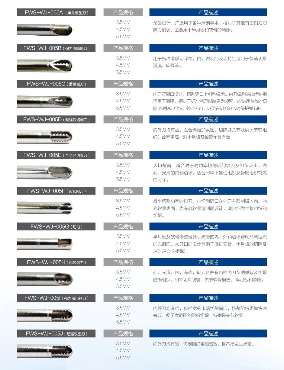 本品與有源器械連接,在關(guān)節(jié)鏡手術(shù)中刨削、吸出損傷、游離的組織或者病灶,適用于在各種大、小關(guān)節(jié)腔內(nèi)切除軟組織和骨質(zhì)。